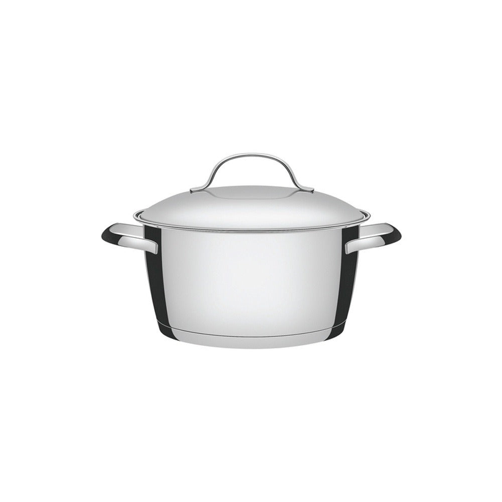 O fundo triplo (aço inox + alumínio + aço inox) distribui o calor de forma uniforme, permitindo cozimento mais rápido e economia de energia. As panelas são compatíveis com fogões a gás, elétrico, vitrocerâmico e indução (exceto o fervedor, cozi-vapore, assadeira e pote).